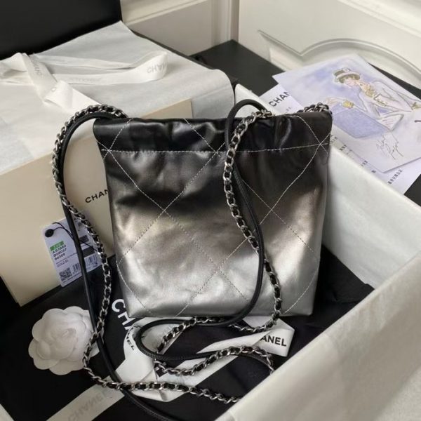 Chanel 22 AS3980 Mini Tote Shiny Calfskin & Silver Metal Silver Black