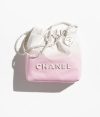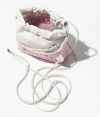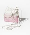 This Chanel Mini 22 Hobo bag is made of white and light pink gradient metallic calfskin with white hardware and signature diamond quilting, white lacquered metal "Chanel" logo on the front, Chanel Paris metal hangtag, white metal and white leather interlaced chain links, long leather cord and long chain link shoulder strap.