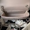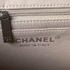 Interior lined with light purple leather with zippered pocket with Chanel zipper and open pocket underneath.