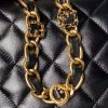 Top handle flap bag in black lambskin with light gold hardware, front flap closure with CC turnlock clasp, interwoven light gold chain links and black leather shoulder/crossbody strap.
