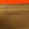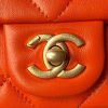 This Chanel Small Flap Bag in orange lambskin with antique gold hardware features a front flap closed with the iconic CC turnlock clasp, tone-on-tone stitching, adjustable antique gold interwoven chain links and orange leather shoulder strap with "pearl" ball attachment.
