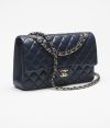 This flap bag is made of dark blue lambskin with gold hardware, front flap with signature CC turnlock closure, half-moon back pocket, adjustable gold interwoven chain link and dark blue leather shoulder strap.
