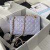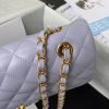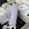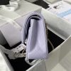 This medium classic double flap bag is made of light purple lambskin leather with light gold hardware, front flap with signature CC turnlock closure, half-moon back pocket, adjustable interwoven light gold chain and light purple leather shoulder strap.