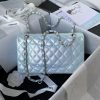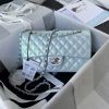 Measurements: 6 x 9.9 x 2.5 in / 15.5 × 25.5 × 6.5 cm This medium classic double flap bag is crafted in ombre lambskin leather with silver-tone hardware, featuring the signature CC turnlock closure on the front flap, half-moon back pocket, adjustable interwoven silver-tone chain and ombre leather shoulder strap. The interior is lined with ombre leather, with a "love letter" zip compartment under the first flap, an "outside" open pocket under the second flap, and an interior compartment with two open pockets separated by a "lipstick" compartment.