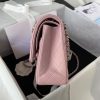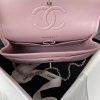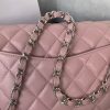 This medium classic double flap bag is crafted in dark pink lambskin with silver hardware, front flap with signature CC turnlock closure, half-moon back pocket, adjustable silver interwoven chain and dark pink leather shoulder strap.