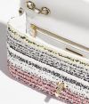 This Chanel mini striped flap bag is of black, white, pink and yellow sequins with light gold hardware and features a front CC turnlock closure, tonal stitching, and one interwoven white leather and light gold chain shoulder/crossbody strap.