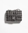 This flap bag is crafted with black and white crystal inlays and features silver-tone hardware. It has a front flap with the signature CC turnlock closure, and an interwoven black leather and silver-tone chain link shoulder/crossbody strap.