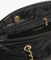 The interior is lined with black grosgrain and has a zip pocket with logo zipper on the back wall.