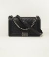 This Chanel Large Boy Bag is crafted in black lambskin with ruthenium hardware and features a full front flap, Le Boy CC snaps and ruthenium-toned chain links, and a black leather padded shoulder/crossbody strap.