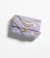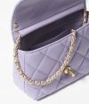 This Chanel Mini Pearl Flap Bag is crafted in metallic light purple shiny lambskin with brushed gold hardware, featuring signature diamond quilted leather, front CC turnlock closure, and convertible brushed gold and pearl leather shoulder strap.