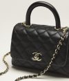 This mini rectangular flap bag features a top handle and is made of black lambskin with gold hardware, front flap with CC turnlock closure, half-moon back pocket, top handle and black leather shoulder/crossbody strap.