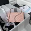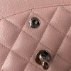 Measurements: 5.7 × 9 × 2.3 in / 14.5 × 23 × 6 cm This small Classic Flap Bag in light pink caviar leather with silver hardware features a front flap with CC turnlock closure, half-moon back pocket, adjustable silver interwoven chain links and light pink leather shoulder/crossbody strap. The interior is lined with light pink leather and features a "love letter" zippered compartment under the first flap, an "outside" open pocket under the second flap, and an interior compartment with two open pockets separated by a "lipstick" compartment.
