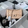 This small Classic Double Flap Bag in beige caviar leather with silver hardware features a front flap with signature CC turnlock closure, half-moon back pockets and adjustable silver interwoven chain link and beige leather shoulder strap.