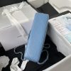 The interior is lined with dark blue leather, with a "love letter" zippered compartment under the first flap, an "outside" open pocket under the second flap, and an interior compartment with two open pockets separated by a "lipstick" compartment.