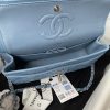 This small Classic Double Flap Bag is crafted in dark blue lambskin with silver hardware, front flap with signature CC turnlock closure, half-moon back pocket, adjustable silver interwoven chain link and light blue leather shoulder strap.