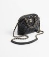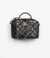This Chanel chain crossbody bag is crafted from shiny black lambskin leather with light gold hardware, signature diamond quilting, light gold CC logo printed on the front, zip closure, half-moon back pockets, and interwoven black leather and light gold chain shoulder/crossbody strap.