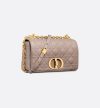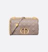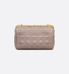 The Dior Caro bag combines modernity with timeless elegance. The silhouette is crafted in warm taupe supple calfskin with Cannage topstitching. The bag features a flap adorned with an antique gold-finish metal CD twist clasp, inspired by the seal of a Christian Dior perfume bottle. The detachable chain shoulder strap with CD signature links allows the medium bag to be carried by hand or worn over the shoulder and may be replaced by one of the House's wide embroidered straps for day or evening attire.