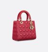 - The Lady Dior bag epitomizes the House's vision of elegance and beauty. Sleek and refined, the timeless yet relevant style is crafted in cherry red lambskin with Cannage stitching, creating the instantly recognizable quilted texture. The pale gold-finish metal signature D.I.O.R. charms offer elegant appeal. Featuring a thin, removable leather shoulder strap, the medium Lady Dior bag can be carried by hand, worn over the