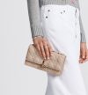 The My Dior mini bag elevates the line with an elegant and functional design. Crafted in powder beige Cannage lambskin, it features a flap enhanced by D.I.O.R. charms on the front. Equipped with compartments and card slots, the functional accessory holds all the essentials and is the ideal day and evening companion. A top handle completed by a removable chain punctuated with resin pearls allows the bag to be carried by hand or worn crossbody.