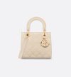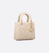 - The Lady Dior bag embodies the House's vision of elegance and beauty. Sleek and refined, the timeless style is crafted in dusty ivory patent calfskin with Cannage stitching, creating the unmistakable quilted texture, while pale gold-finish metal D.I.O.R. charms embellish and illuminate its silhouette. Featuring a thin, removable leather strap, the small Lady Dior bag can be carried by hand or worn crossbody.