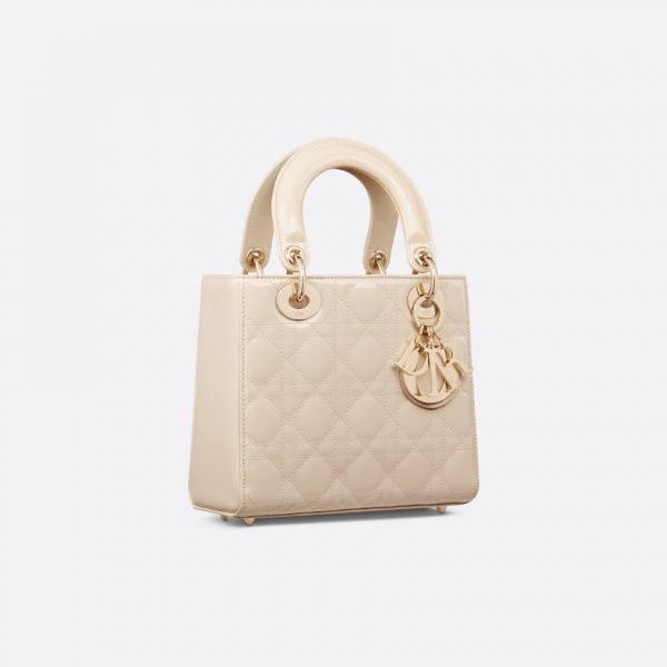 - The Lady Dior bag epitomizes Dior's vision of elegance and beauty. Sleek and refined, the timeless style is crafted in black ultra-glossy patent calfskin with Cannage stitching, creating the instantly recognizable quilted texture. Shiny black-finish metal D.I.O.R. charms further embellish its silhouette. The small Lady Dior bag features a thin, removable leather shoulder strap and can be carried by hand or worn crossbody.