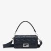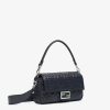 Iconic medium Baguette bag made of midnight blue soft nappa leather with a three-dimensional texture embossed FF motif. Decorated with an FF clasp. Featuring a front flap, magnetic clasp, a single internal compartment with zipper pocket and palladium-finish metalware. The bag can be carried by hand, or worn either on the shoulder or cross-body thanks to the handle and shoulder strap, both detachable.