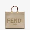 Medium Sunshine Shopper bag made of dove gray leather with hot-stamped FENDI ROMA lettering and stiff tortoiseshell-effect plexiglass handles. Features a spacious lined internal compartment, edges in tone on tone leather, and gold-finish metalware. Can be carried by hand or worn on the shoulder thanks to the two handles and detachable shoulder strap. Made in Italy