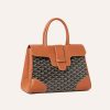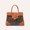 This Goyard Saigon soft tote is in black Goyardine coated canvas and tan chevroches calfskin with palladium hardware, contrast stitching, features two double rolled top handles, signature saigon leather strap and loop closure, a cutout in the top of the flap for the handle to fit through.