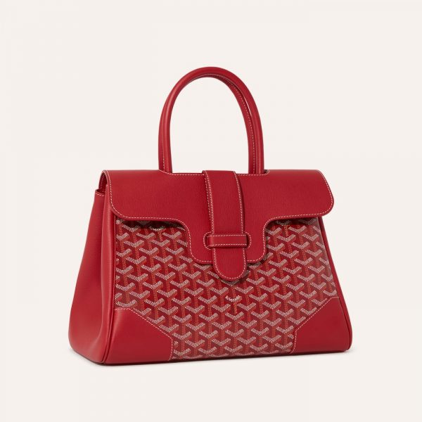This Soft Saigon Tote is in red Goyardine Coated Canvas and Chevroches Calfskin with palladium hardware, contrast stitching, features two double rolled top handles, signature saigon leather strap and loop closure, a cutout in the top of the flap for the handle to fit through.