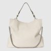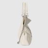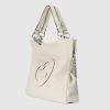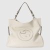 The Gucci Blondie line characteristically features the Round Interlocking G inspired by the archival symbol. This Gucci Blondie bag, with both top handle and chain shoulder strap, spotlights the emblem as a subtly crafted leather patch.