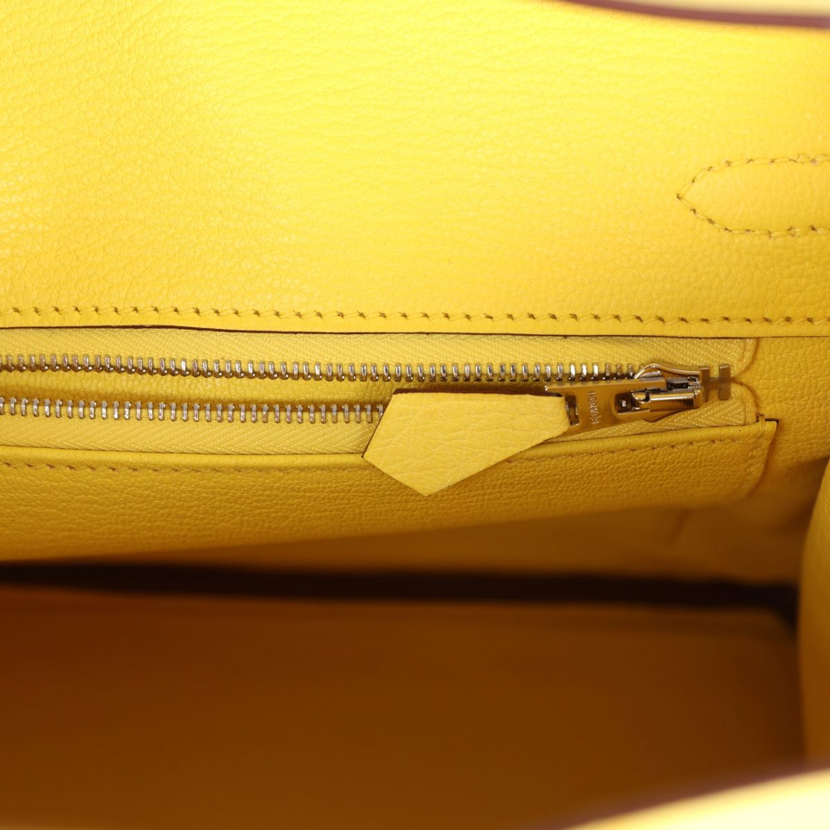The interior is lined with Jaune Citron chevre and has one zip pocket with an Hermès engraved zipper pull and an open pocket on the opposite side.