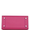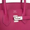 Measurements: 10" width x 7.5" height x 4.75" depth; 2.75" handle drop This Sellier Birkin is in Rose Pourpre veau madame leather with palladium hardware and has tonal stitching, front flap, two straps with center toggle closure, clochette with lock and two keys, and double rolled handles. The interior is lined with Rose Pourpre chevre and has one zip pocket with an Hermès engraved zipper pull and an open pocket on the opposite side.