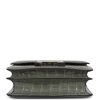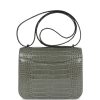 This Constance 1-18 Gris Ciment Shiny Alligator Mississippiensis leather with palladium hardware, tonal stitching, metal "H" snap closure, and an adjustable strap.