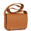 This Hermès Geta Bag is in Caramel chevre leather with gold hardware, tonal stitching, single magnetic flap closure, and adjustable shoulder strap.