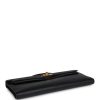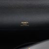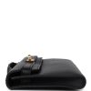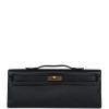 This Hermès Kelly Cut is in Black swift leather with gold hardware, features tonal stitching, front flap, pull straps that attach to a toggle, and small top handle.