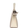 This Special Order Kelly, in the Sellier style, is in Craie and Bleu Saphir epsom leather with permabrass hardware, has contrast Bleu Saphir stitching, two front straps with front toggle closure, single rolled handle and removable shoulder strap.