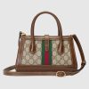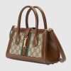 The Jackie 1961 line is further elevated through new sizes and styles, including a rectangular-shaped version with a top handle and detachable shoulder strap. The gold-toned piston hardware appears against the archival green and red Web stripe.