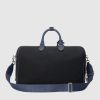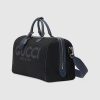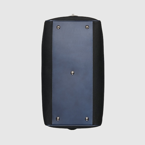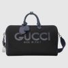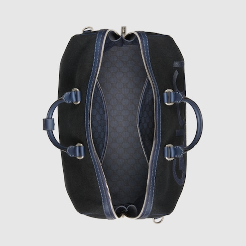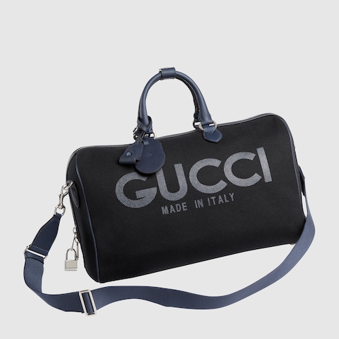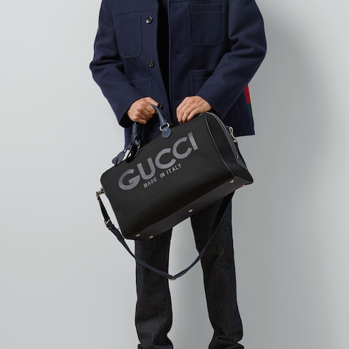 Ideal for travels and other occasions, the House's iteration of the popular lightweight material, canvas, is presented on totes, clutches, and bucket bags in every size. This black duffle bag features the 'Gucci Made in Italy' print across the front with a dark blue leather trim.