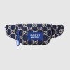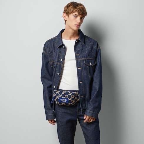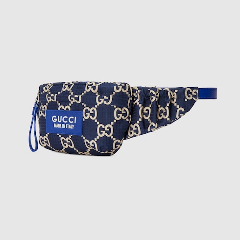Introduced for Cruise 2024, the main characteristic of the new ripstop recycled polyester is the GG logo. The fabric is lightweight thanks to the play of yarns and of a high quality, allowing styles to remain unlined. The final result is technical yet elegant accessories that offer practicality with a modern feel. Here it appears in dark blue and beige atop this belt bag, complete with a Gucci Made in Italy patch.