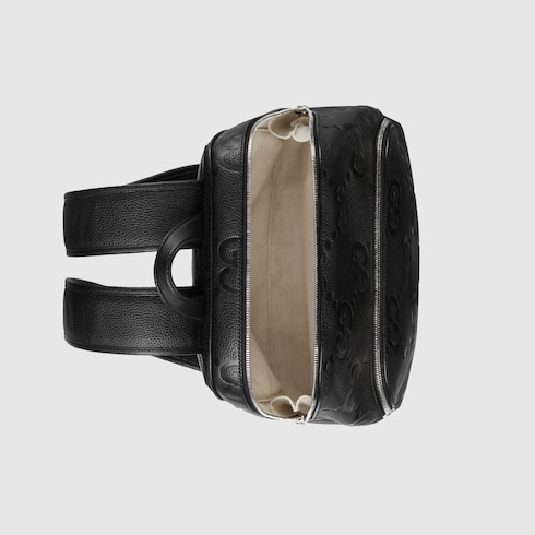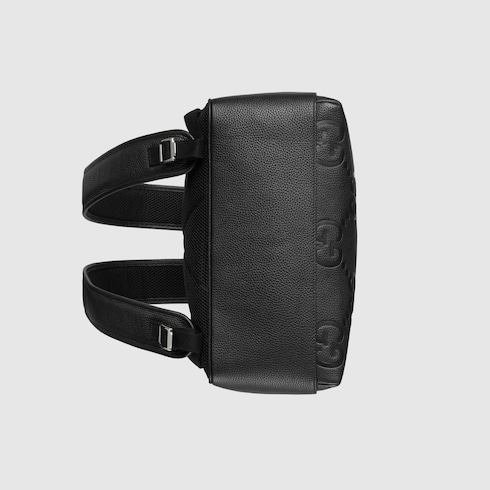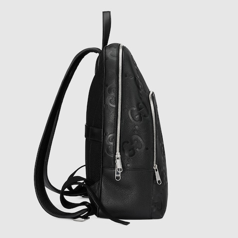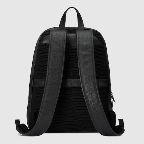 The all-black jumbo GG design continues for Cruise 2024 atop a selection of leather accessories. A reinterpretation of Guccio Gucci's initials, the motif is an evergreen of the House that appears prominently in maxi size for an eye-catching logo feel. This backpack in the emblematic leather features an inside and outside pocket with easy wear shoulder straps.