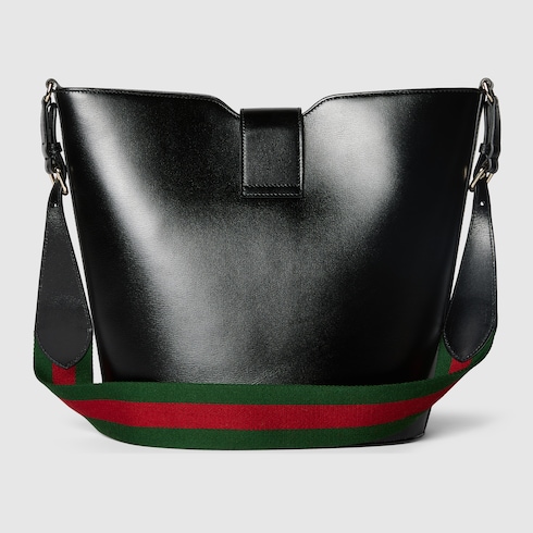 This medium bucket shoulder bag is crafted in black leather. This accessory is a perfect blend of functionality and modernity thanks to the design with hook closure and a Web shoulder strap.