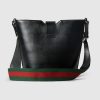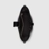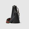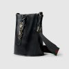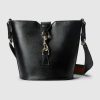 This mini bucket shoulder bag is crafted in black leather. This accessory is a perfect blend of functionality and modernity thanks to the design with hook closure and a Web shoulder strap.