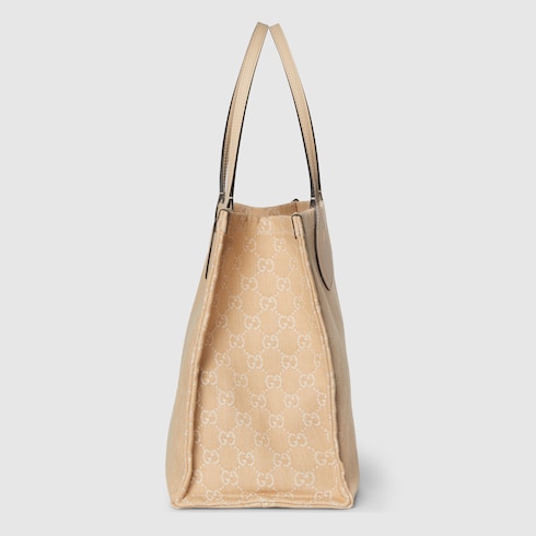 The Ophidia totes are presented in colored denim for the Spring Summer 2024 collection, like this large-sized piece crafted in light beige GG denim, complete with light gold-toned hardware for a touch of metallic contrast.