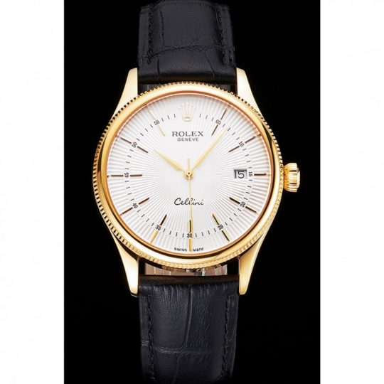 Rolex Cellini Date White Dial Gold Case Black Leather Strap