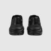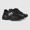 Designs inspired by the sporting world are interpreted through the Gucci lens with standout logo details. This pair of black leather Rhyton sneakers is defined by a bold Interlocking G cut-out in a contrasting hue, presenting a new take on the House logo.