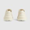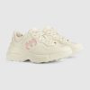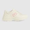 Designs inspired by the sporting world are interpreted through the Gucci lens with standout logo details. This pair of ivory leather Rhyton sneakers is defined by a bold Interlocking G cut-out in a contrasting hue, presenting a new take on the House logo.