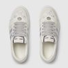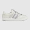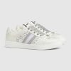 Influenced by classic trainers from the '70s, the Screener sneakers—named for the defensive sports move—feature the Web stripe on the side and the vintage Gucci logo. Here the style is reimagined in grey leather and white GG Crystal canvas, while a grey and white glittery Web completes the style.